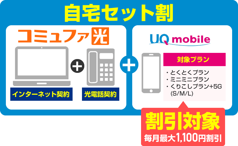 コミュファ光の「インターネット+光電話」を契約し、更にUQモバイルの「トクトクプラン」「ミニミニプラン」「くりこしプランS +5G」「くりこしプランM +5G」「くりこしプランL +5G」のいずれかのプランで契約すると自宅セット割が適用可能となります。